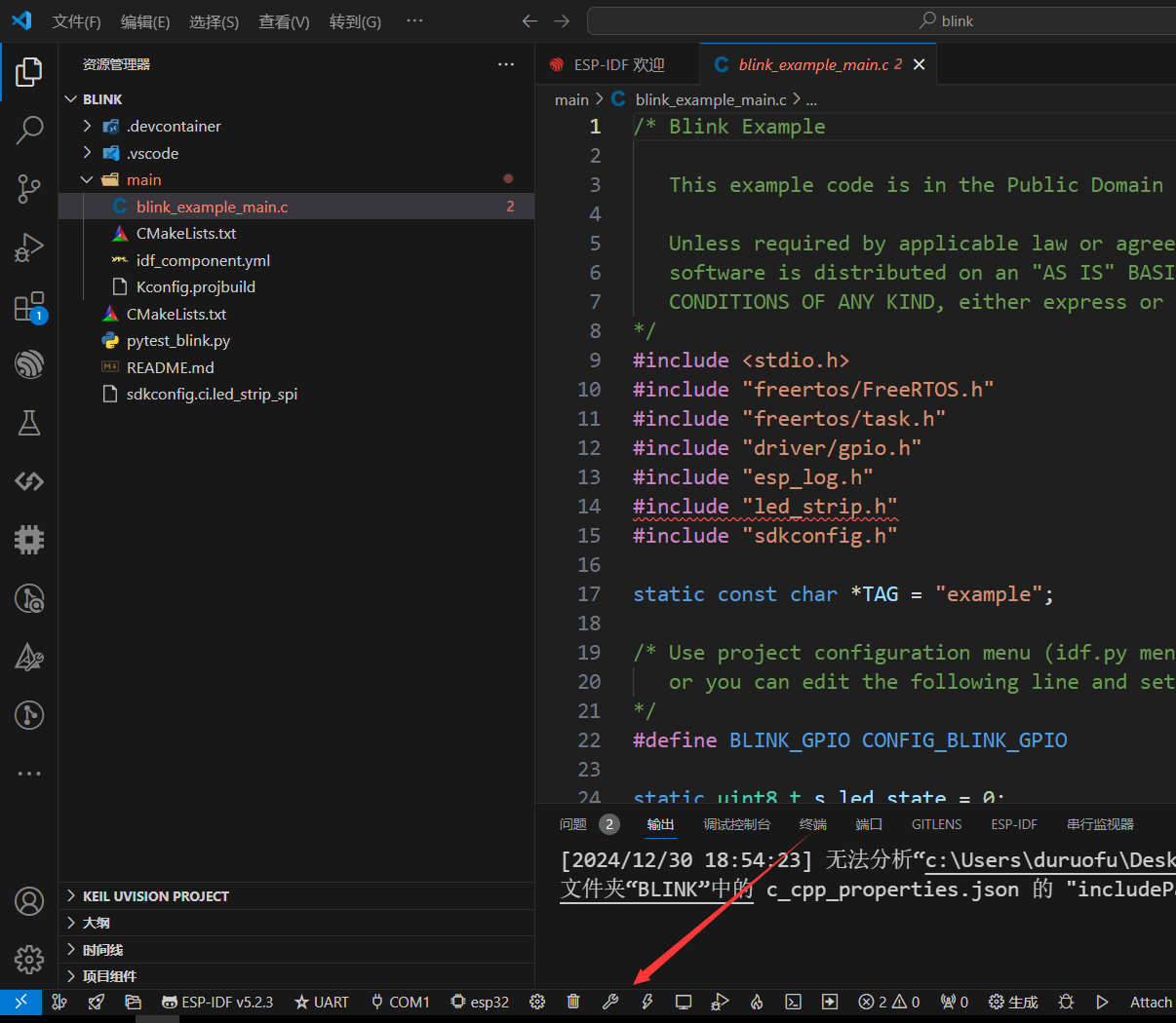 运行后编译完成输出如下,则开发环境安装无误,至此ESP32的开发环境就准备完毕了: