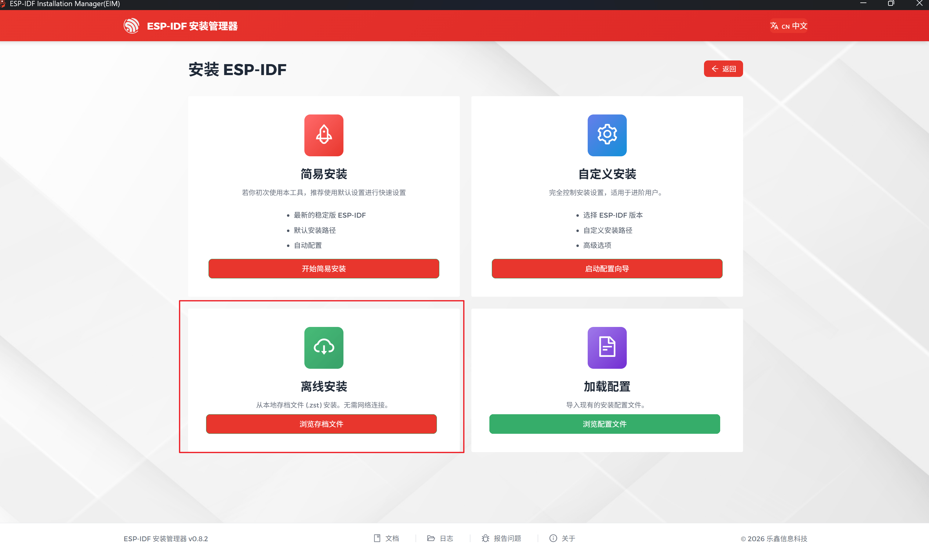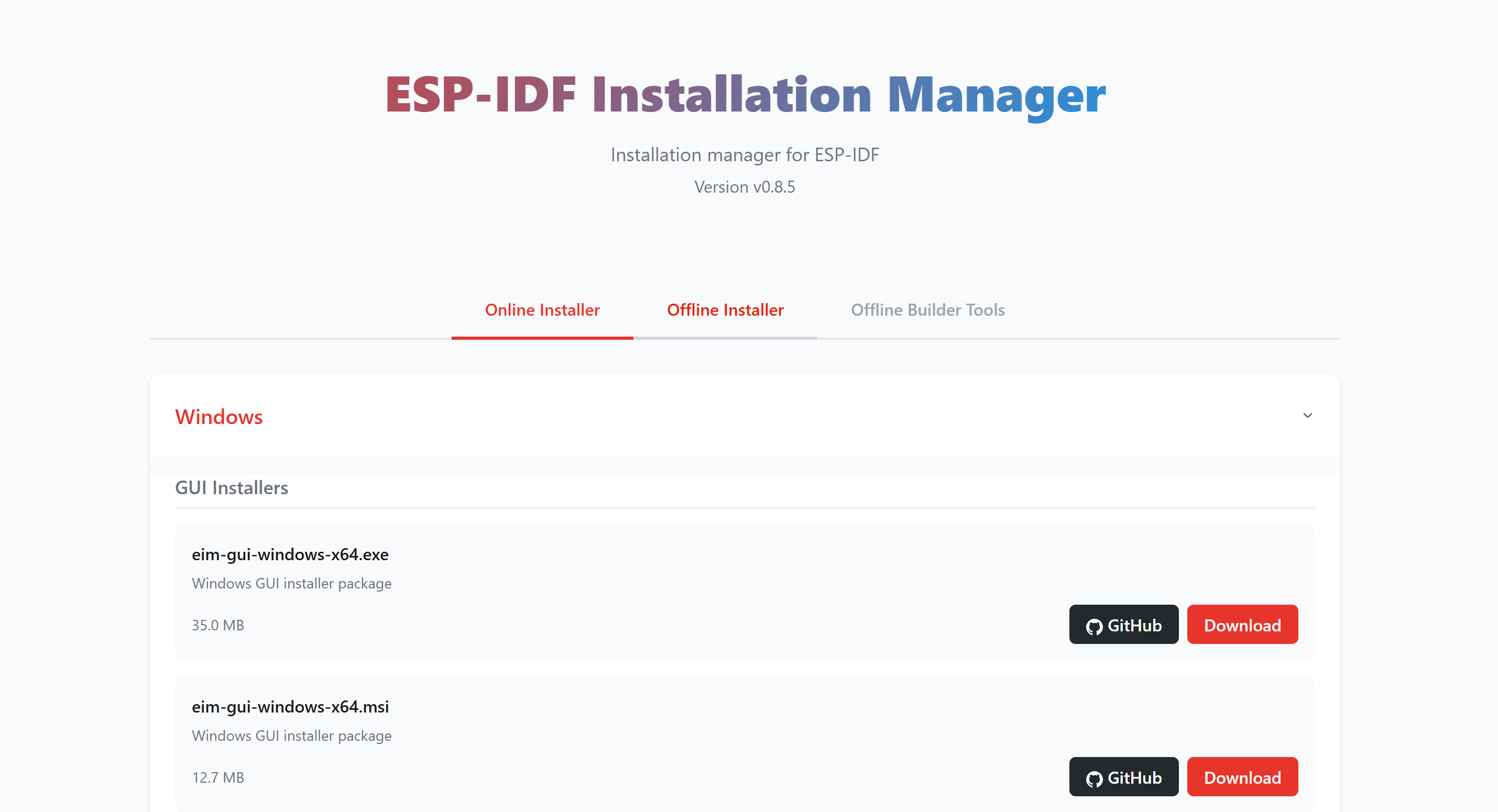离线安装需要回到EIM的网站去手动下载存档文件,链接: https://dl.espressif.com/dl/eim/?tab=offline ,界面如下: