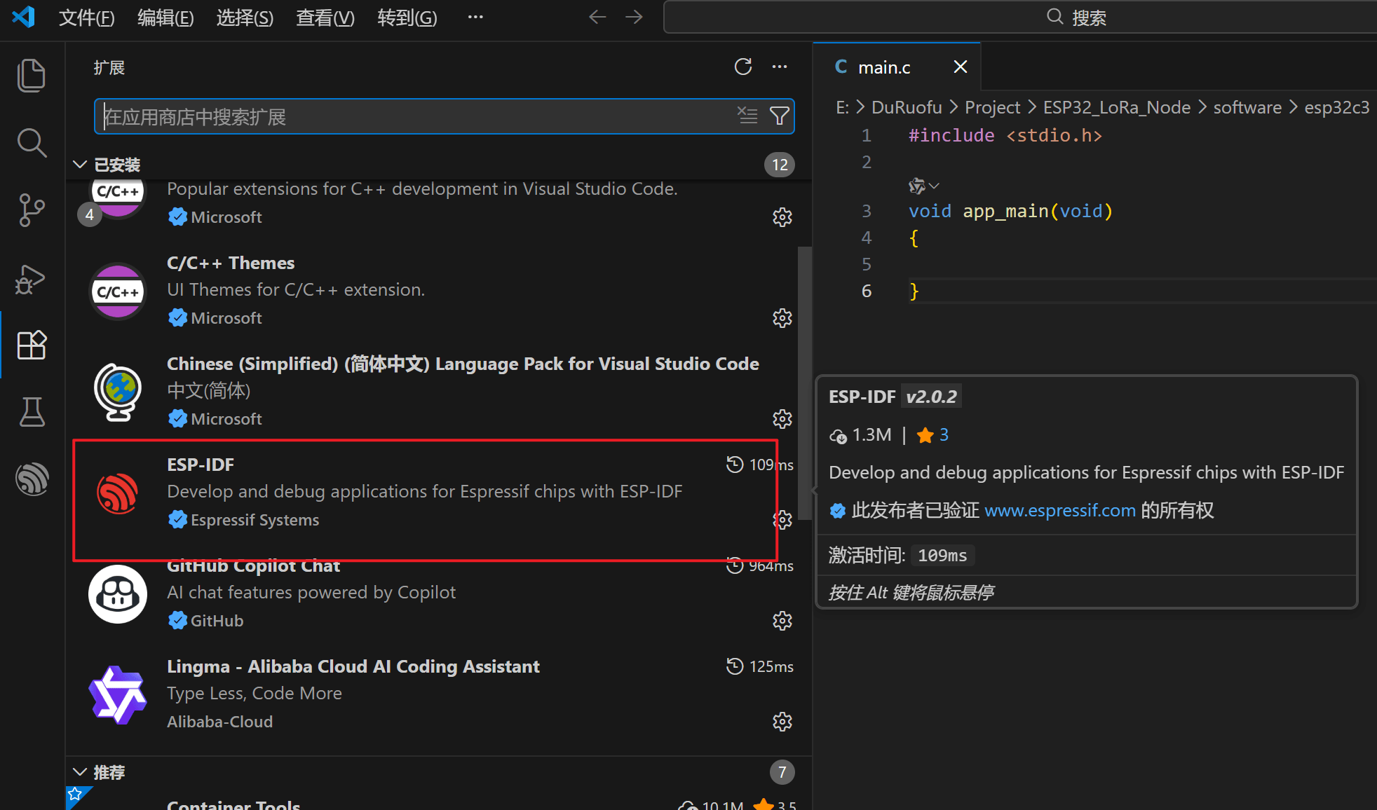 2. 在扩展商店搜索 Espressif IDF,找到官方插件并安装。 注意:请确保插件版本为 v2.0.0 或更高,旧版本可能无法完美支持 EIM。