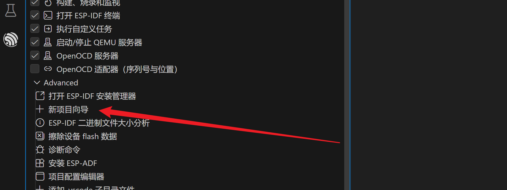 可以看到已经可以识别到我们安装的环境了,不需要以前在插件里还要进行繁琐的配置了。这是2.0版本插件最大的升级。 至此我们就配置好了ESP-IDF的开发环境。