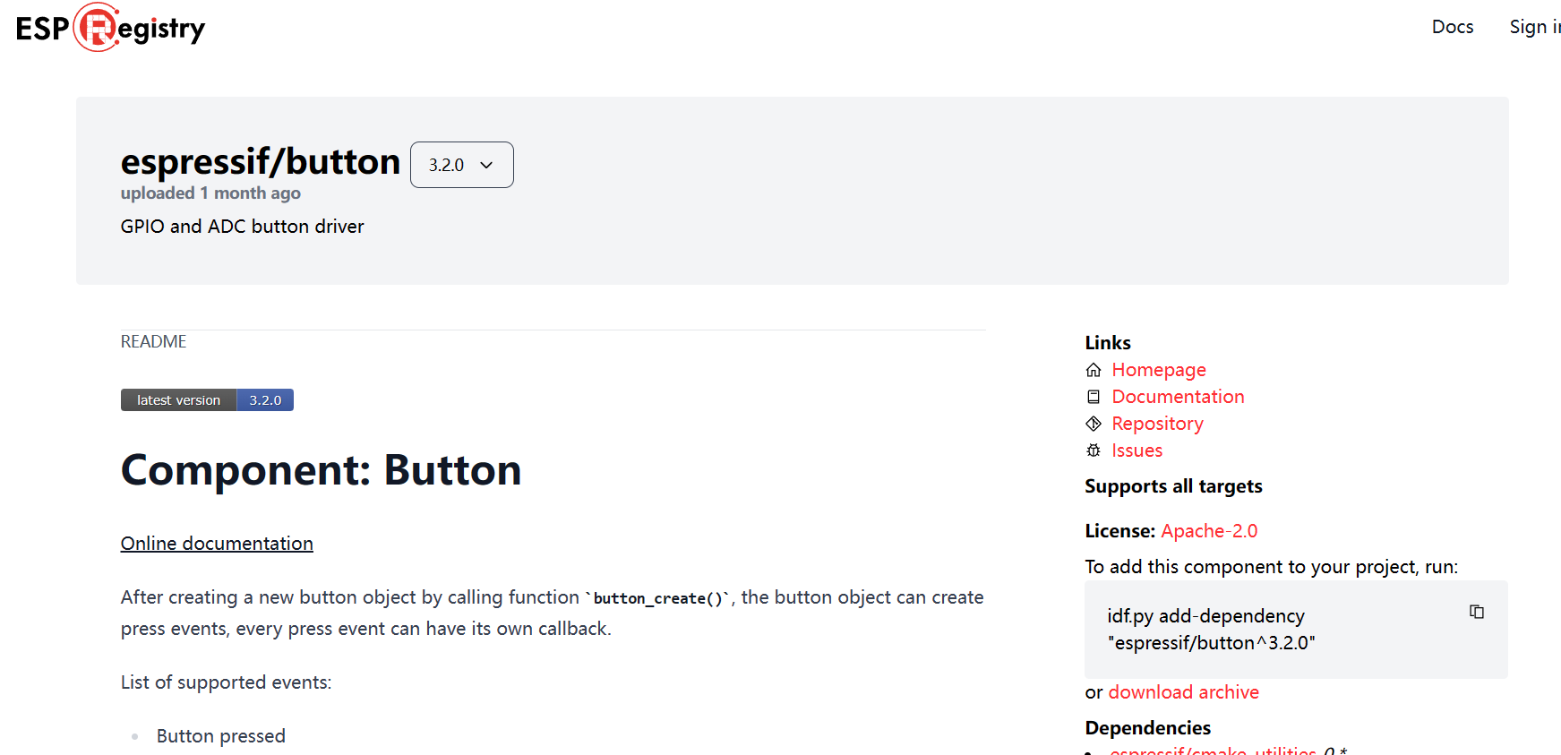 输入命令添加依赖 idf.py add-dependency "espressif/button^3.2.0" :