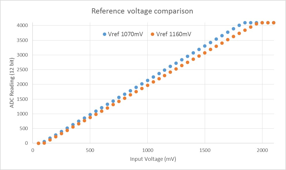 上图列出了参考电压分别在:V r e f = =1070mV(蓝色) 和 V r e f = =1160mV(橙色) 下的 ADC 值和待测电压 Voltage 的关系。